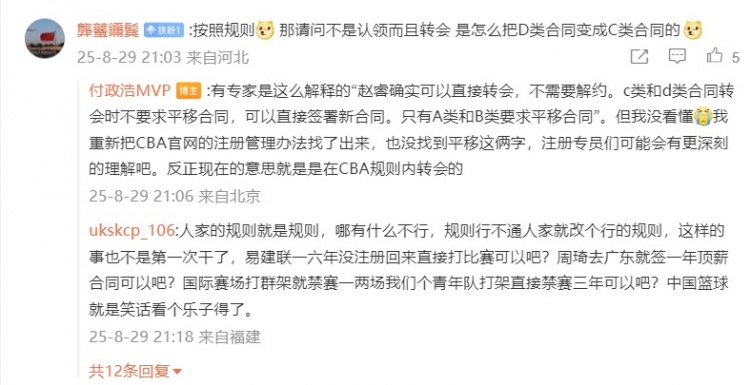 有网友表示:“按照规则,那请问不是认领而且转会,是怎么把D类合同变成C类合同的。”付政浩回复:“有专家是这么解释的‘赵睿确实可以直接转会,不需要解约。c类和d类合同转会时不要求平移合同,可以直接签署新合同。只有A类和B类要求平移合同’。但我没看懂。我重新把CBA官网的注册管理办法找了出来,也没找到平移这俩字,注册专员们可能会有更深刻的理解吧。反正现在的意思就是是在CBA规则内转会的。”