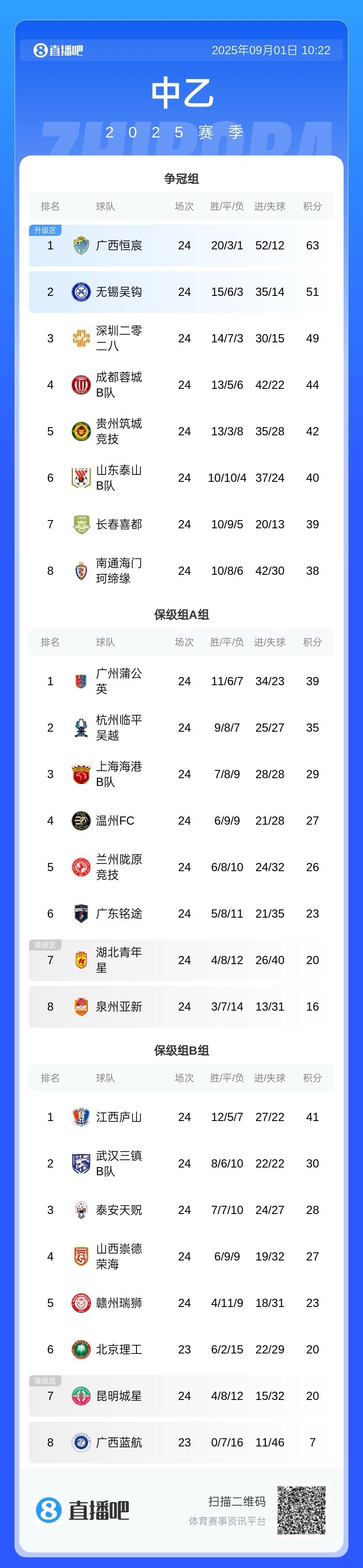 9月1日讯 中乙保级组结束第24轮争夺,海港B队2-2战平广州蒲公英,武汉三镇B队0-1不敌北京理工,广西蓝航1-1泰安天贶仍难求一胜。